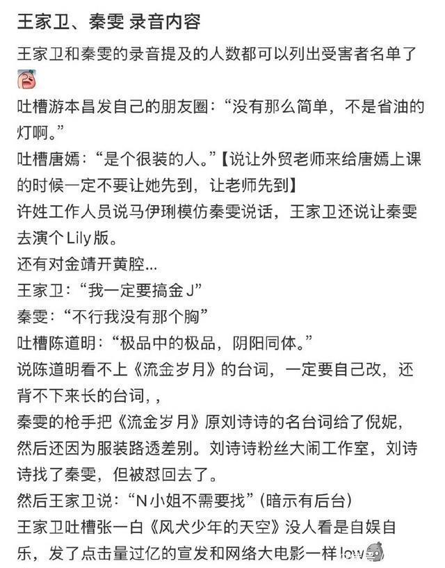 录音显示王家卫与秦雯开低俗玩笑如“一定要搞金靖”“装胸有什么难”,此类言论突破职业伦理底线,难称冤枉。